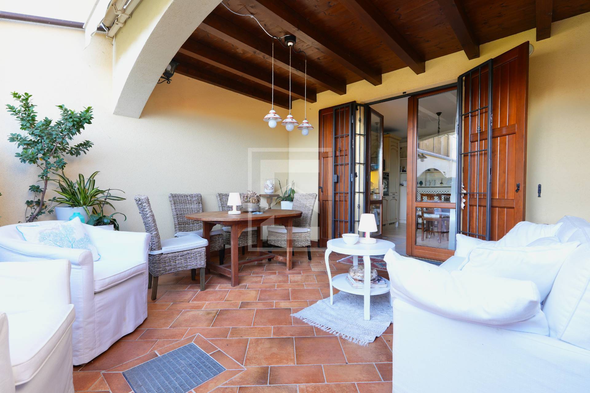 L'appartamento si trova al piano terra, entrando troviamo la zona giorno dotata di cucina a vista e accesso diretto al portico esterno. Tramite disimpegno si accede alla zona notte composta da camera matrimoniale con porta finestra dalla quale si accede al giardino, una camera singola e un bagno finestrato con box doccia. L'appartamento gode di un giardino privato esposto a sud-ovest dotato di vasca idromassaggio privata. L'ampio portico coperto affaccia direttamente sull'interno del residence, uno spazio ideale per cene all'aperto e momenti di relax.