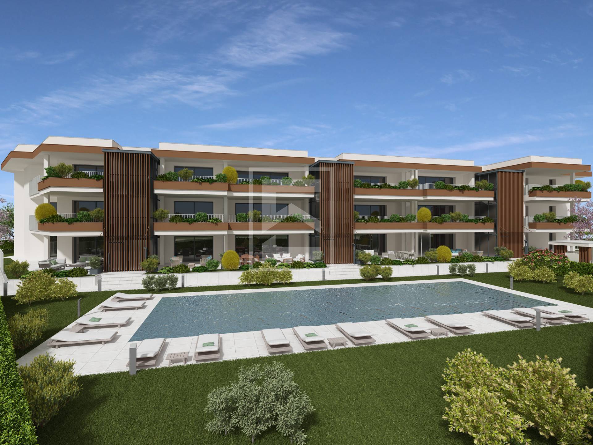 L'architettura è essenziale e raffinata: grandi vetrate, volumi ordinati e terrazze profonde che diventano un vero prolungamento degli spazi interni.