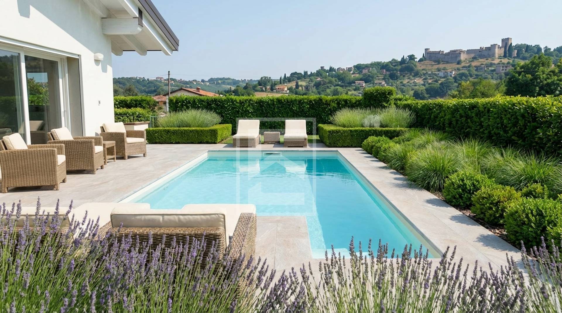 L'ampio giardino disposto su 4 lati ospita la piscina a sfioro con spiaggetta immersa nell'acqua, gradinata per accedervi, solarium piastrellato ed illuminazione notturna. I piacevoli porticati consentono deliziosi momenti di relax all'aperto con la splendida vista sul castello.